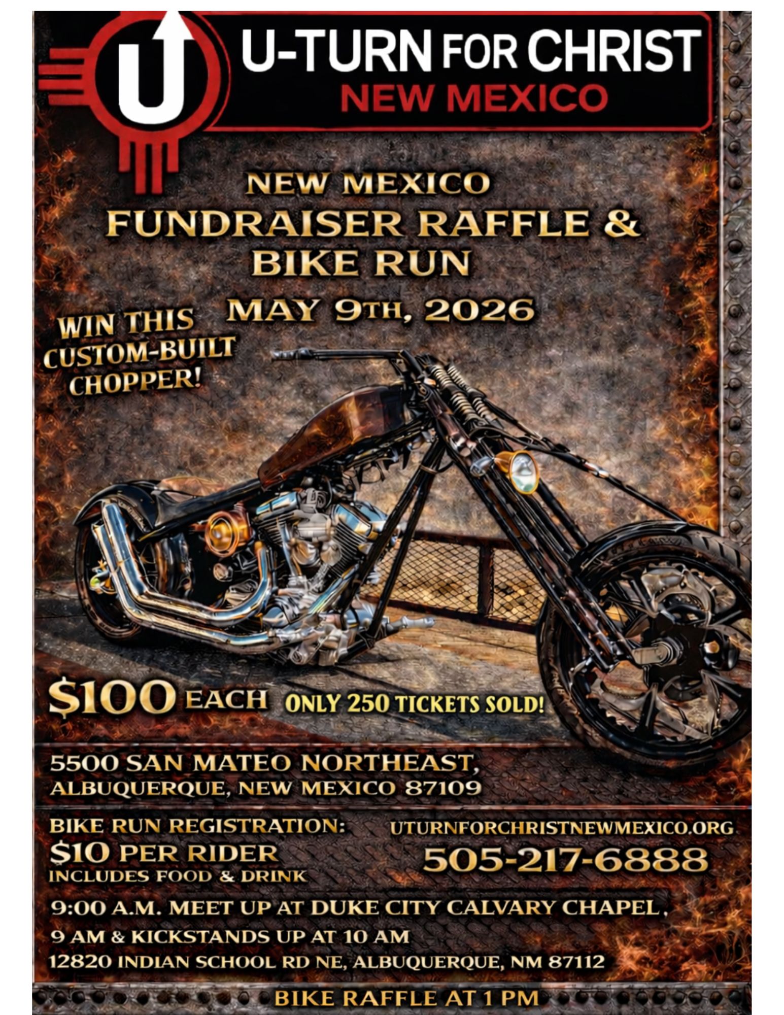 Join us on May 9th at 9:00 a.m. for our Custom Chopper Fundraiser & Bike Run hosted by U-Turn for Christ New Mexico, benefiting the men’s and women’s ranches. Riders will gather at 9:00 a.m., with kickstands up at 9:30 a.m. from Calvary Chapel East, and the run will conclude with a motorcycle raffle and community celebration at 5500 San Mateo NE, hosted by the U-Turn for Christ New Mexico Thrift Store and The Well Coffee NM.